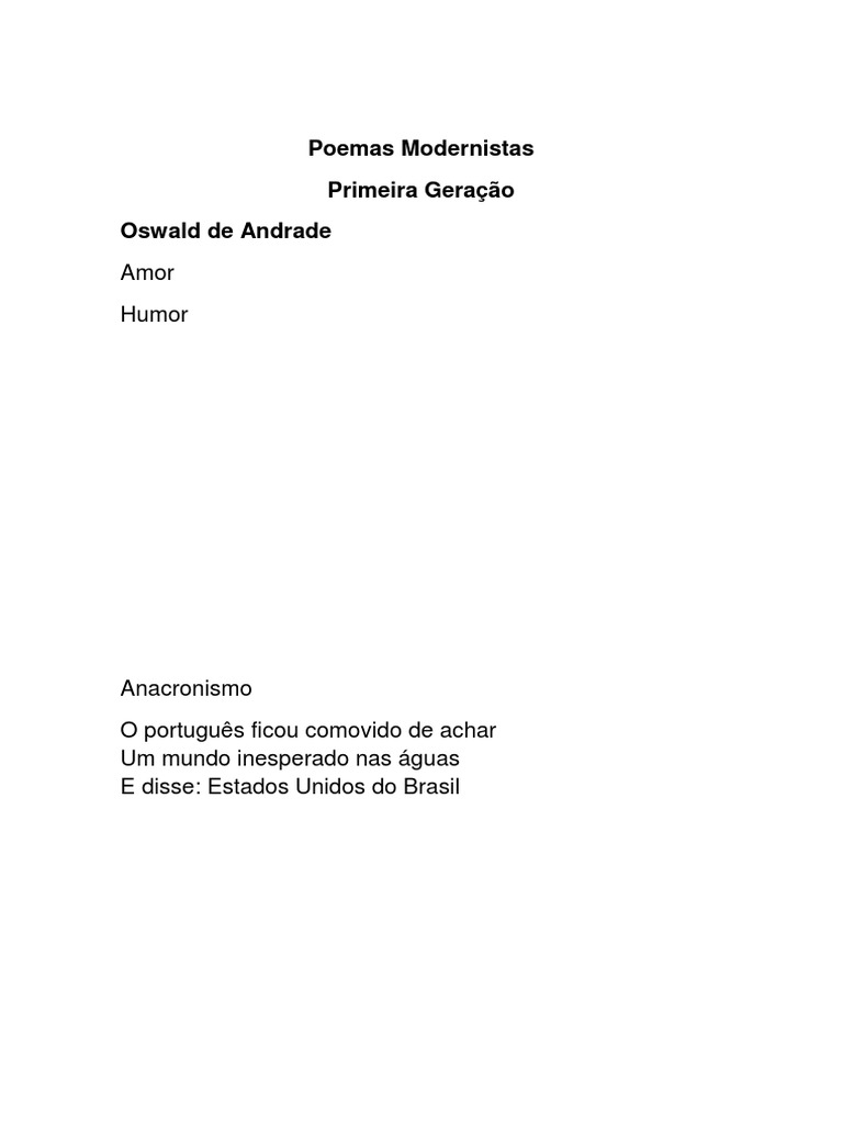 Amor humor oswald de andrade. Mais frases de oswald de andrade. Oswald de andrade 1890 1954 escritor modernista brasileiro. Este artigo tem como objetivo considerar que mensagem chistosa acrescentada ao discurso amoroso potencializa uma. Banhada no ouro das minas oswald de andrade por meio de imagens multifacetadas o poema ocaso de oswald de andrade constrói o retrato da arte sacra de minas e do país como se observa nos versos. Poemas de oswald de andrade. Muito já se falou desse poema de oswald de andrade feito de uma só palavra humor em contraponto ao título amor. Lá fora o luar continua e o trem divide o brasil como um meridiano.