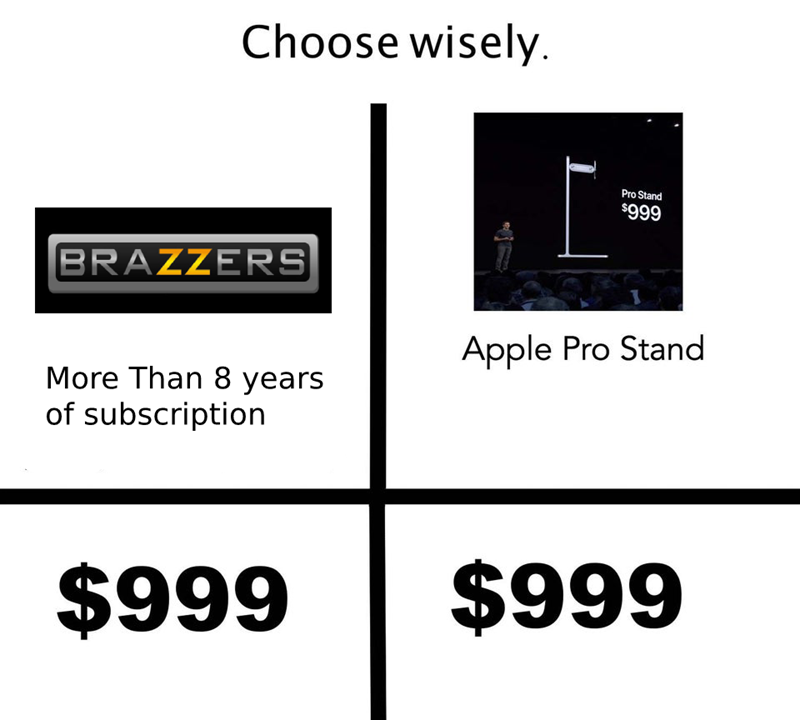 Apple memes stand. The mac pro starts at a hefty 5999 and is best enjoyed with a new pro display xdr that starts at 4999 and comes without a monitor stand. 999 dollars for a fucking stand. Which you will need. In the most apple move ever the company unveiled its new 999 dollar monitor stand at wwdc 2019. Apple revealed its worthy 999 dollar monitor on wwdc 2019. If you buy the base model mac pro one apple monitor and the apple pro stand you re going to have to drop 11 000. The moms will hate you.