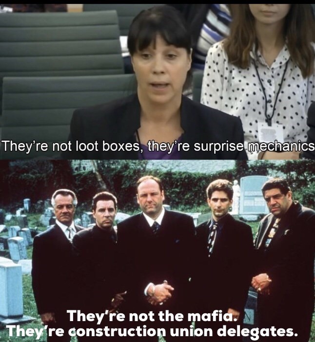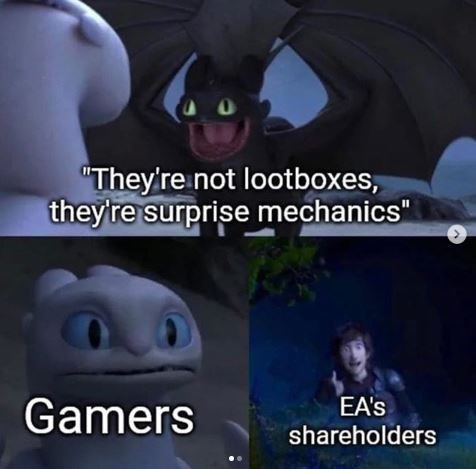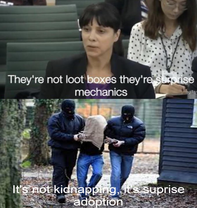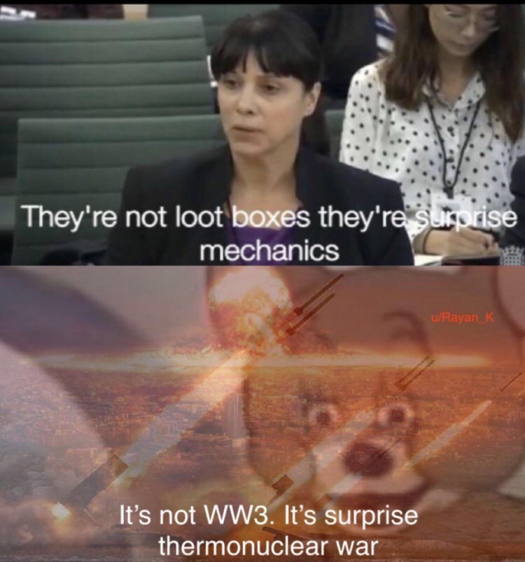 Ea surprise mechanics meme. Time to see if i can ethically acquire platinum. Loot boxes actually surprise mechanics that are ethical and fun gaming reps at uk parliamentary panel also answer charges of addictive game design. Caption a meme or image make a gif make a chart make a demotivational flip through images. Catchphrase parody year 2019 origin uk digital culture media and sport committee hearing tags ea loot boxes reddit about. Friends through such shady tactics i have looted and plundered and been handsomely rewarded for my low quality humor post. She also said that ea does not consider loot boxes sorry surprise mechanics to be gambling and we also disagree that there s evidence that shows it leads to gambling. A senior executive at electronic arts told the united kingdom s parliament that the company prefers to call loot boxes surprise mechanics and argued that their use in ea games is quite ethical.
