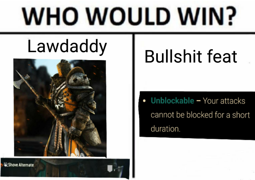 The pauldrons possess sword breakers an attribute of many 16th century pauldrons. Sorry about the wait. Salt montage 2 pre reworked warden pre parry core fight update. I literally put in every meme and joke related to lawbringer that i could. Welcome to the meme corner of r forhonor. A for honor meme compilation. The 1 ranked lawbringer.